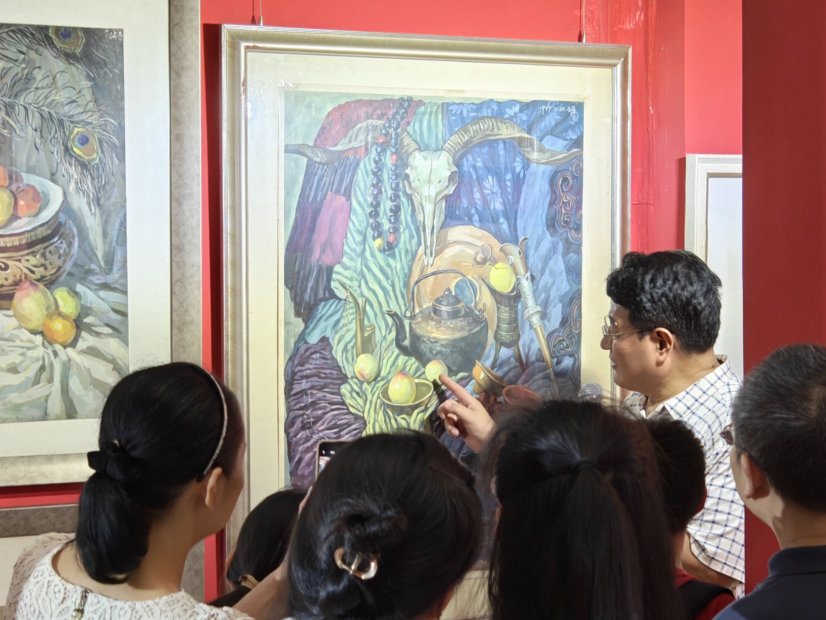 活动现场,来自沙坪坝区多所中小学的数十名热爱美术的学生在许世虎的带领下,参观了美术馆的精品展陈。馆内陈列着许世虎多年来的代表作品,涵盖油画、水彩、综合材料等多个门类。学生们在一幅幅色彩绚丽、意境深远的画作前驻足,认真聆听讲解,感受艺术带来的视觉震撼与情感共鸣。