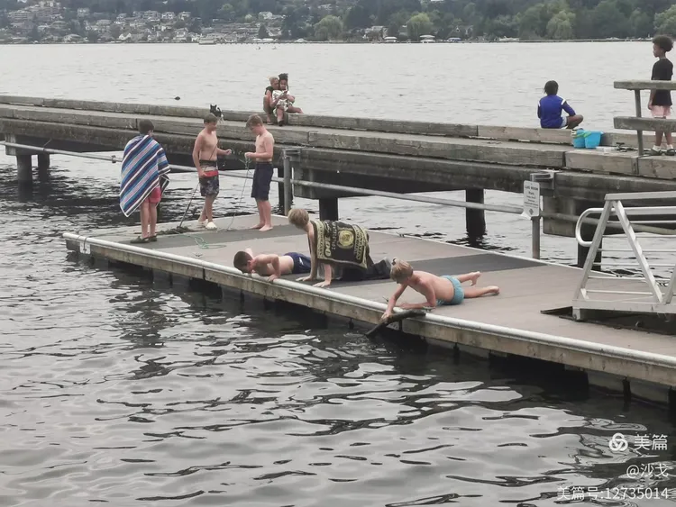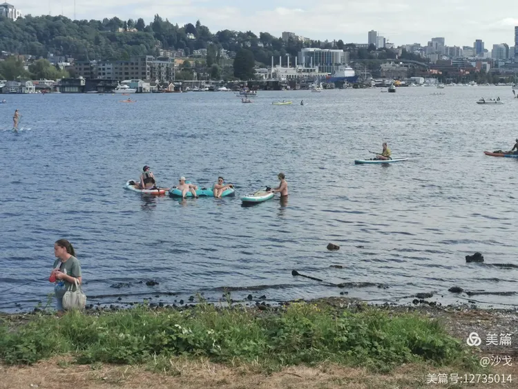 不少人下到华盛顿湖中游泳、荡舟(艇)、戏水。