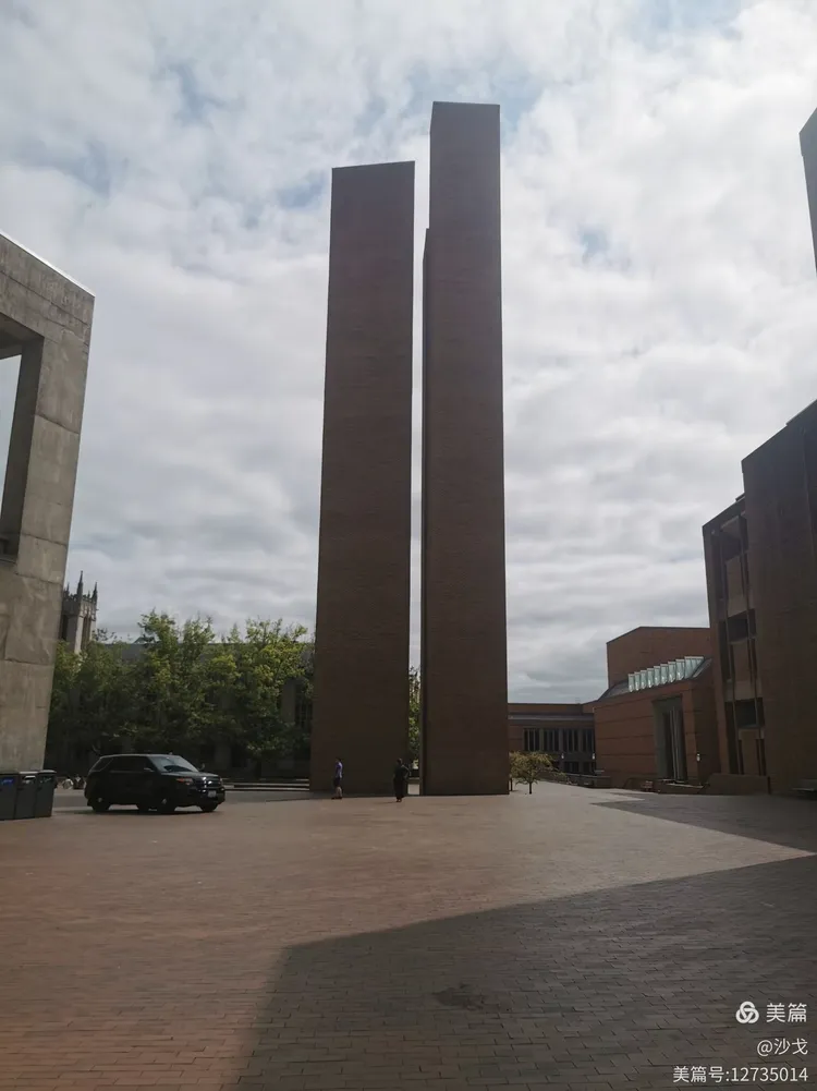 西雅图有许多旅游景点。比如太空针塔(航天航空)、奥林匹克公园(雨林与雪山),雷尼尔山(全美最高火山)……我们驱车在华盛顿大学地域宽阔的校区中随意转悠。转了很久,却没有找到校门、围墙之类藩篱。正值暑期,学生很少。市民可在校区自由溜达。大学园区内树林密布。图正中有窥视的松鼠。W造型雕或许意味着是华盛顿大学校门