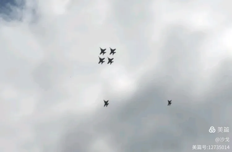 途中,有飞机在天空轰鸣列队而过。