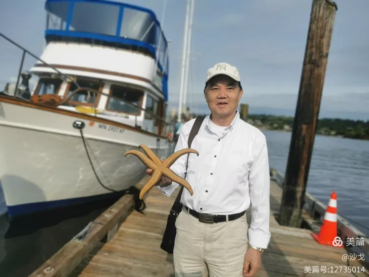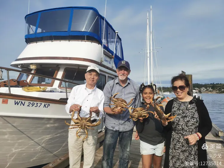 与渔夫爷孙持螃蟹留念