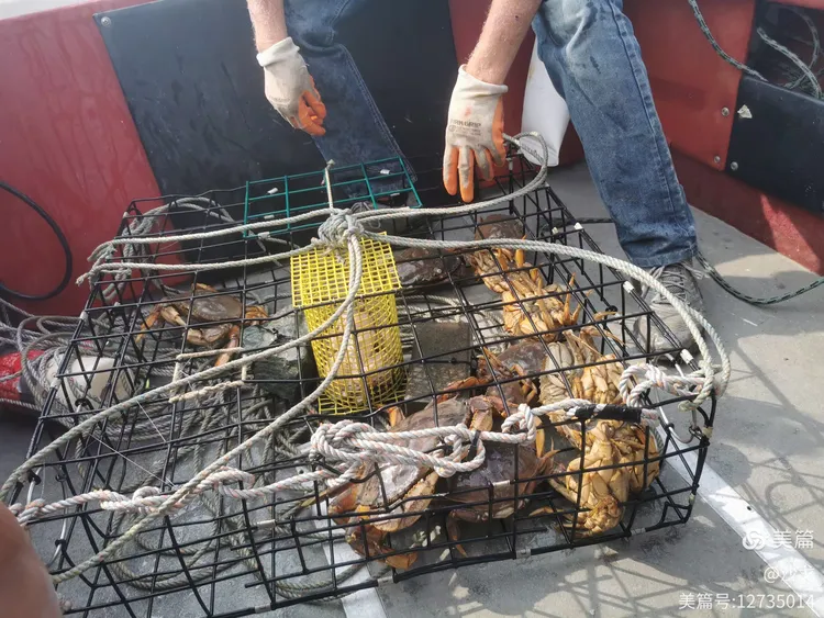 大家喜形于色。框中有十来只螃蟹。收获颇丰。意外地,渔夫却将一只又一只螃蟹扔进海里。原来,捕捞只能要公的,母的扔回去继续繁衍;个头小的不要,待再长大些再捕捞。估计一般要有一斤左右才要。