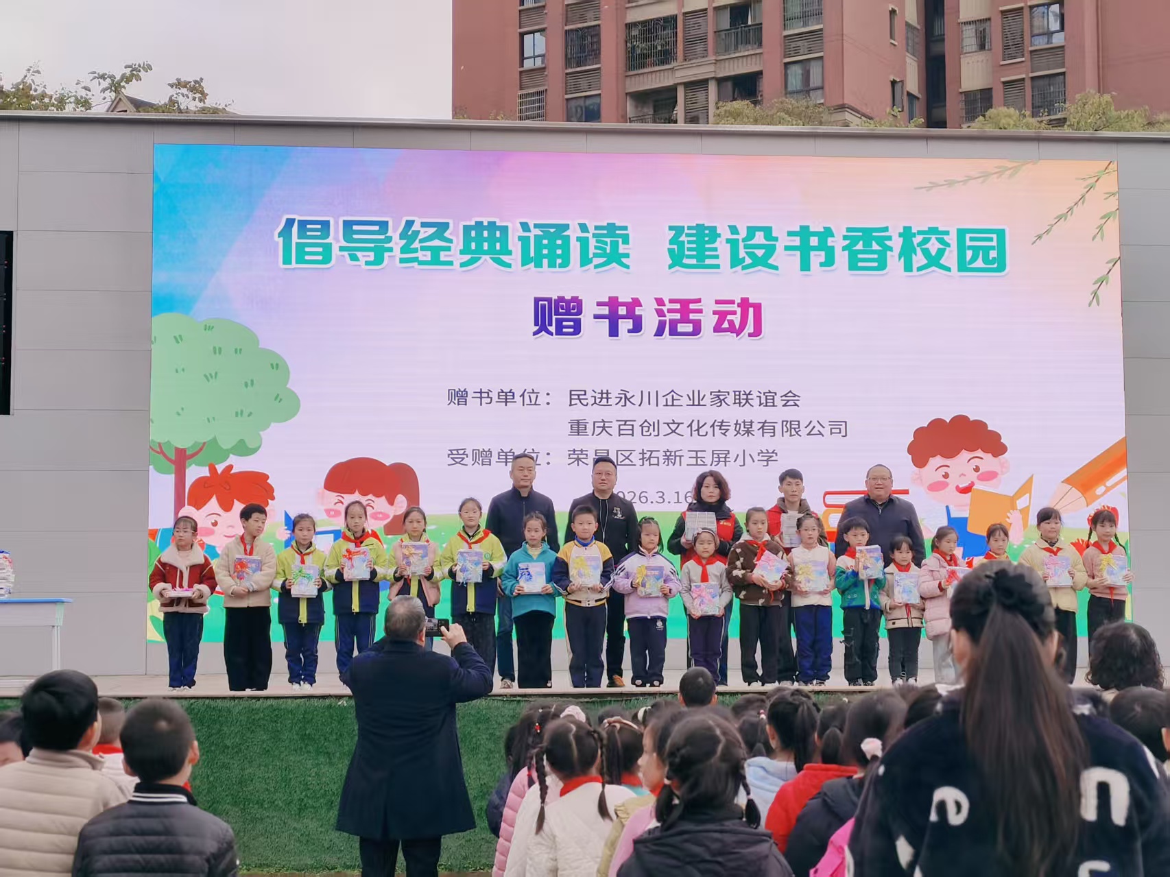 3月17日,民进永川区委会“倡导经典诵读 建设书香校园”第六期工程——书院·童书馆赠书活动走进荣昌区拓新玉屏小学。重庆市作家协会副主席、永川区政协原副主席、一级巡视员钟代华,民进永川企业家联谊会会长周伟、副会长张希等出席活动。