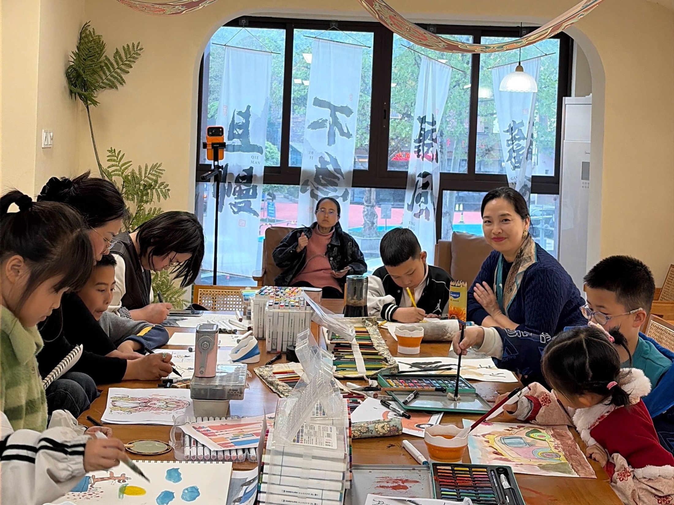 除了旧物交换和二手集市,原江北开明书画院秘书长寇涛精心绘制了多把以家风家训为主题的扇面进行公益售卖,将传统文化以生活艺术的形式,走进寻常百姓家。民进会员刘盈盈为到场的孩子们提供亲子共读、艺术体验,让孩子们体验了一个不一样的周末下午。