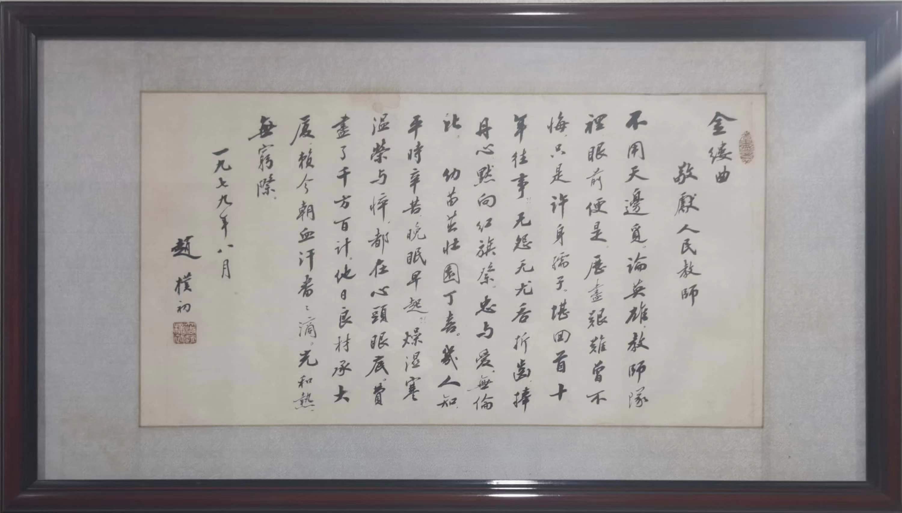 曹树国一行代表支部对苏老师的身体健康、生活情况进行了关心和慰问。苏老师见到支部的同志非常高兴,由衷地感谢支部对他的关心,并表示支部上门走访慰问体现了民进会员一家亲的优良传统。今年是民进南岸区委会成立四十周年,苏老师特意为区委会朗诵诗作《红旗颂》以示庆贺。一行人参观了苏老师的书画室,特别参观了一副赵朴初先生的书法真迹。这是民进创始人之一、曾任中国佛教协会会长、全国政协副主席的赵朴初先生送给苏老师父亲的真迹,非常宝贵。苏老师还是一位京剧票友,他师承程派(程砚秋,工于花旦),扮演旦角,扮相漂亮,非常吸睛。