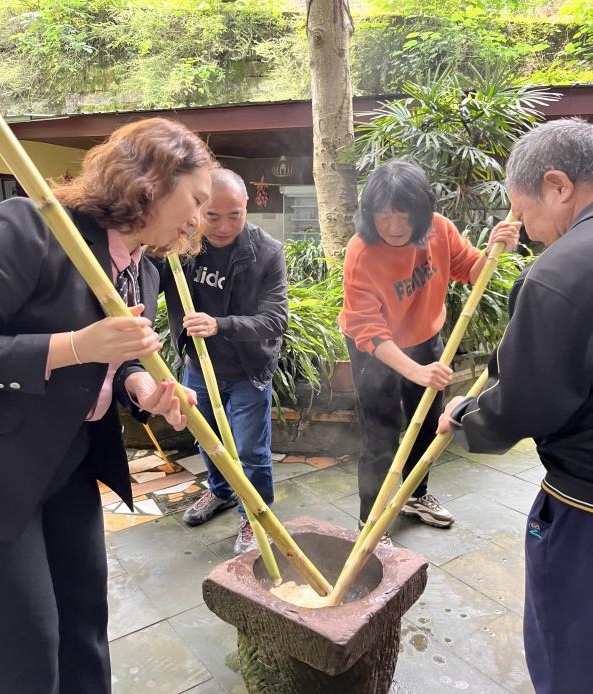 观影后会员们来到城外城农家乐,体验打糍粑。石臼中糯米粒粒晶莹、热气腾腾,米香氤氲,大家热情的挥舞着糍粑杵棒,感受着中国传统习俗的魅力,同时也感受着民进大家庭的温馨与幸福。老会员们三两携手,相谈甚欢,追忆过去,畅叙友情,言辞间洋溢着老一辈民进会员们浓浓的家国情怀,表达出自己身处温暖的民进大家庭的自豪之情。