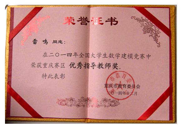 近日获悉,民进南岸区委委员、重庆交通大学教授雷鸣指导学生参加二零一四年高教社杯第二十一届全国大学生数学建模竞赛再创佳绩,指导的学生颜馨、杨顺娟、宋玉洋获得全国大学生数学建模竞赛一等奖,指导的另外两组学生魏童、曹志成、刘泽一,李丹、李梦影、张喆分别获得全国大学生数学建模竞赛重庆赛区二等奖,雷鸣老师获得重庆市教育委员会颁发的重庆赛区“优秀指导教师奖”。