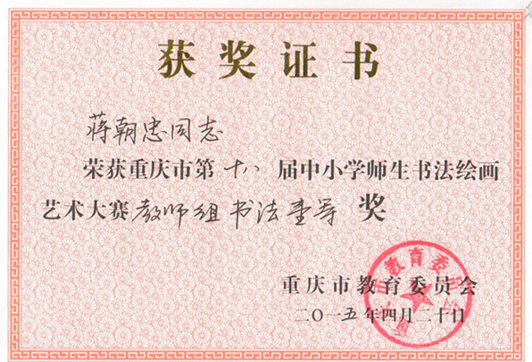 近日,民进重庆市第49中学支部主委蒋朝忠在重庆市第十八届中小学师生书法绘画艺术大赛中荣获教师组书法一等奖。
