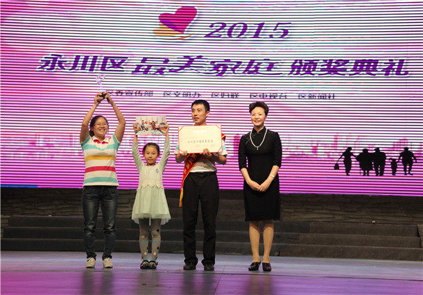 2015年9月24日下午,永川区举行2015年“最美家庭”颁奖典礼。共有十个家庭荣获永川区2015年“十佳最美家庭”称号,其中有永川民进会员卢定国家庭和民进会员康中燕家庭。区委副书记王志杰、副区长孔萍分别为卢定国家庭和康中燕家庭颁奖。