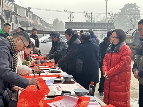 为进一步弘扬中华优秀传统文化,履行社会服务职责,助力基层文化建设,1月12日,民进大足区委会在龙岗街道明星社区开展乙巳(2025)“春联万家·大道同行”活动,现场为居民们书写并赠送春联和福字,为居民们送去新春的祝福。民进大足区委会主委蔡明兰出席活动