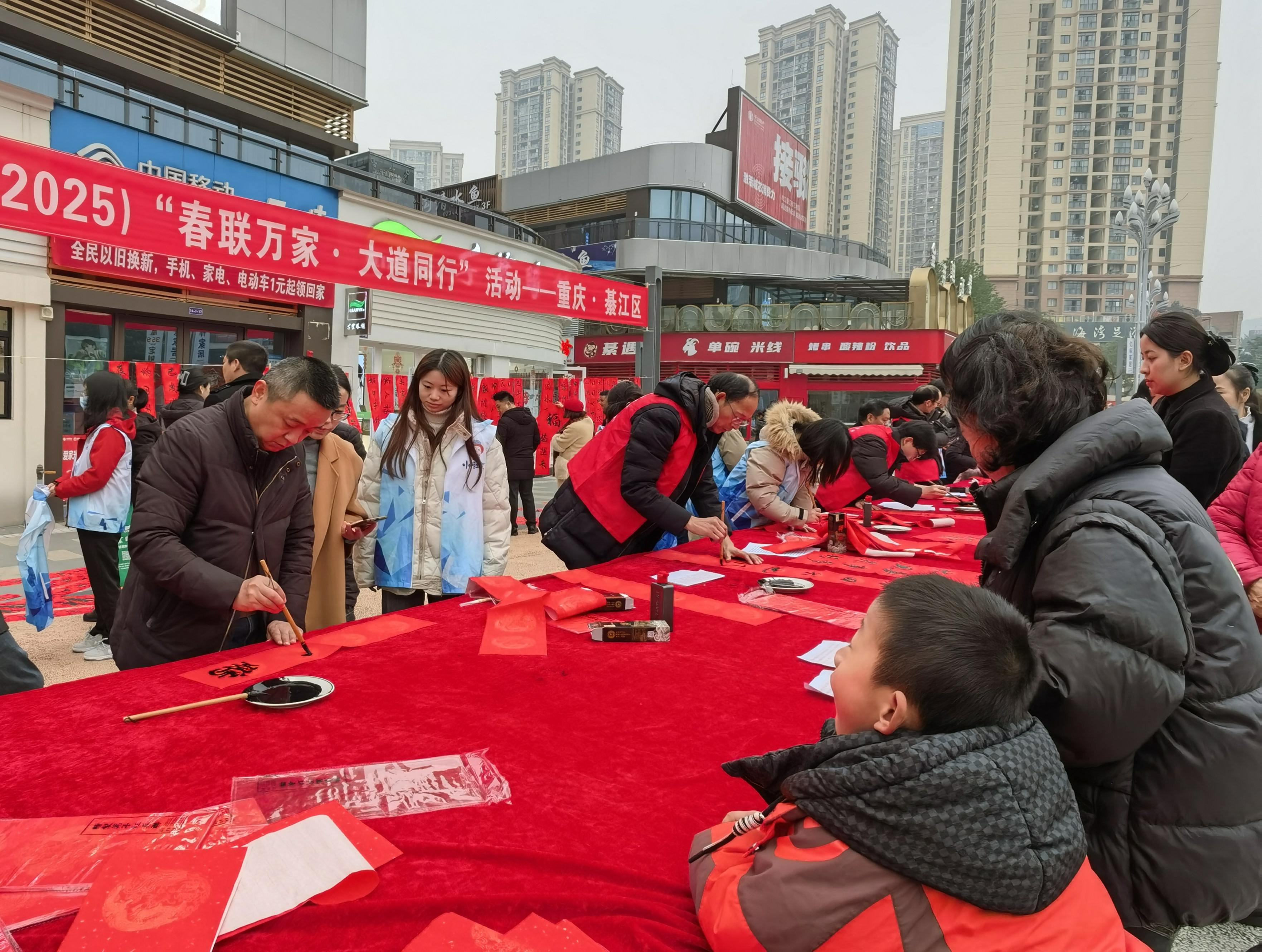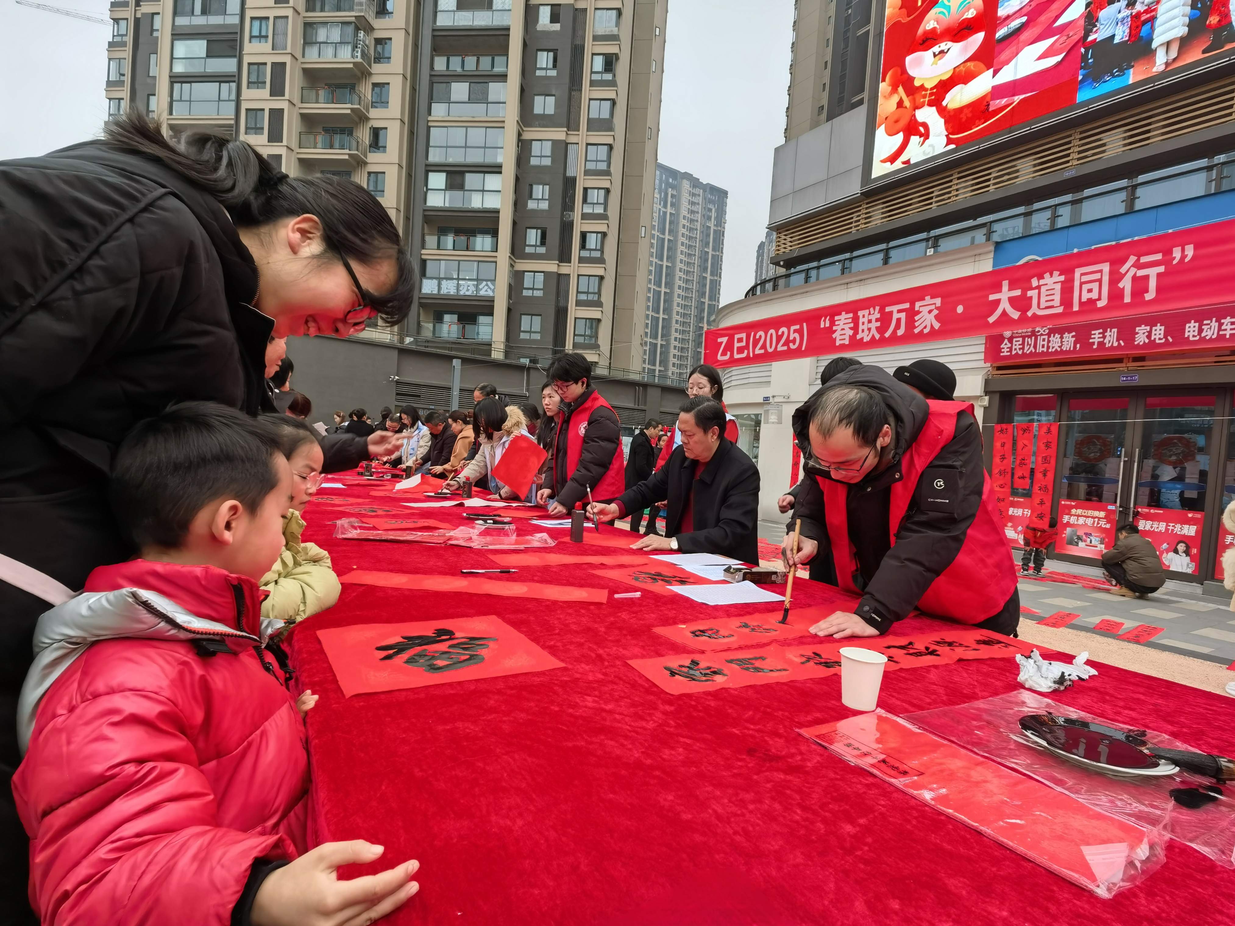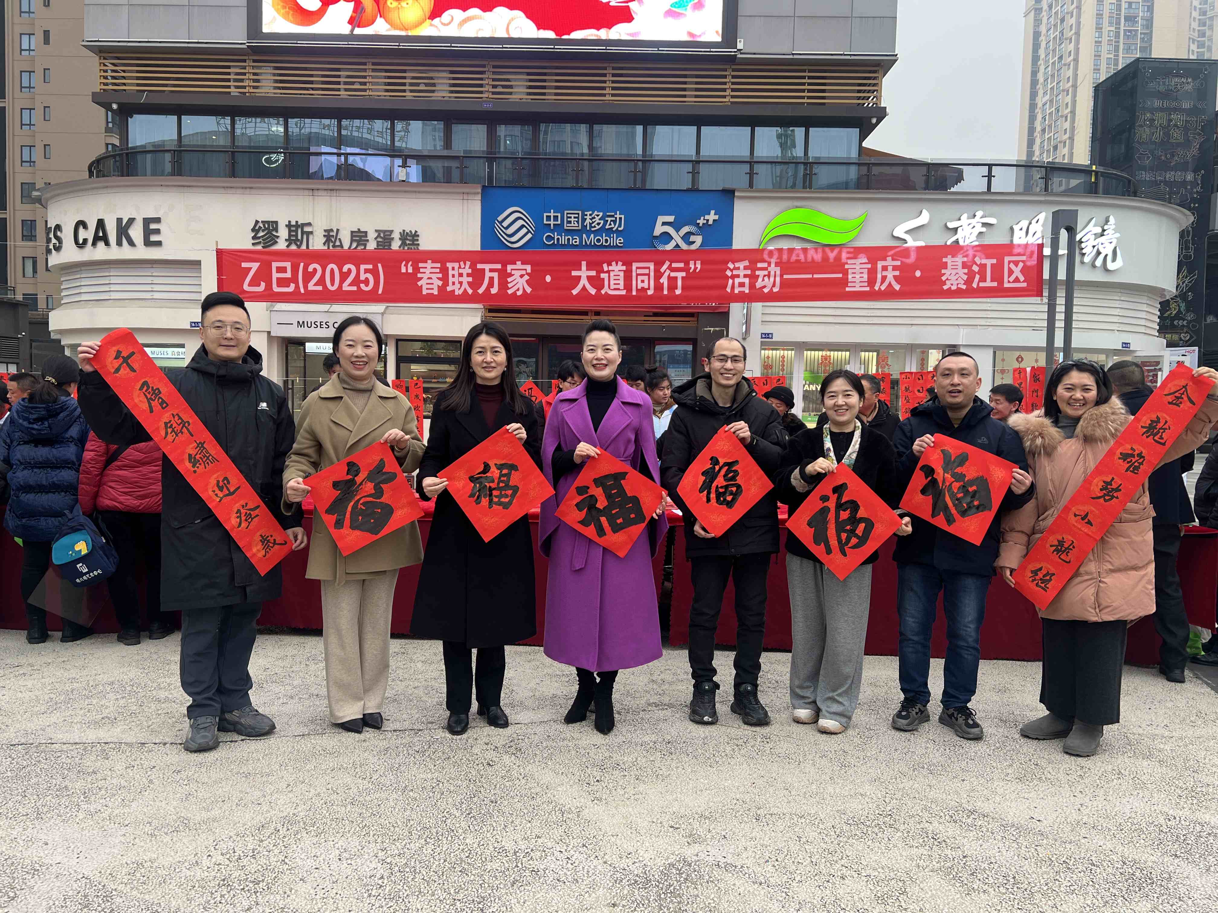1月17日,民进綦江区委会在通惠街道联惠社区千山天域金街开展乙巳(2025)全国“春联万家·大道同行”活动,为居民现场写春联送祝福。民进綦江区委会副主委傅明月、吴佳玲参加活动。