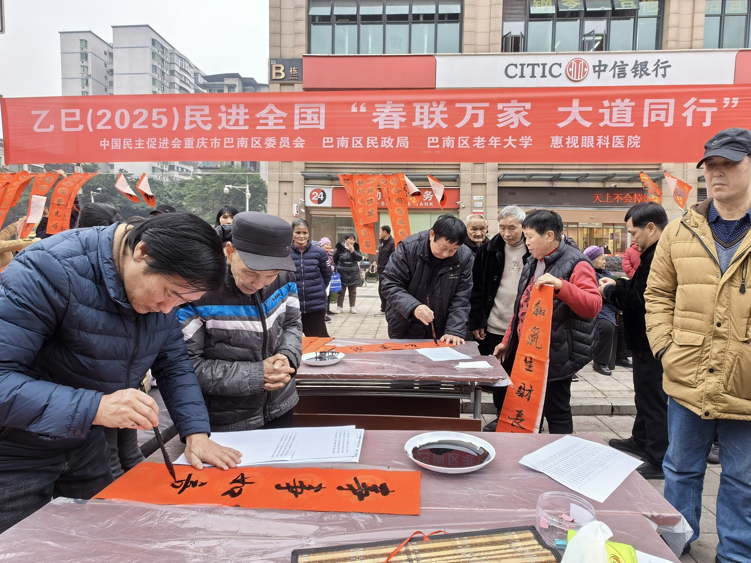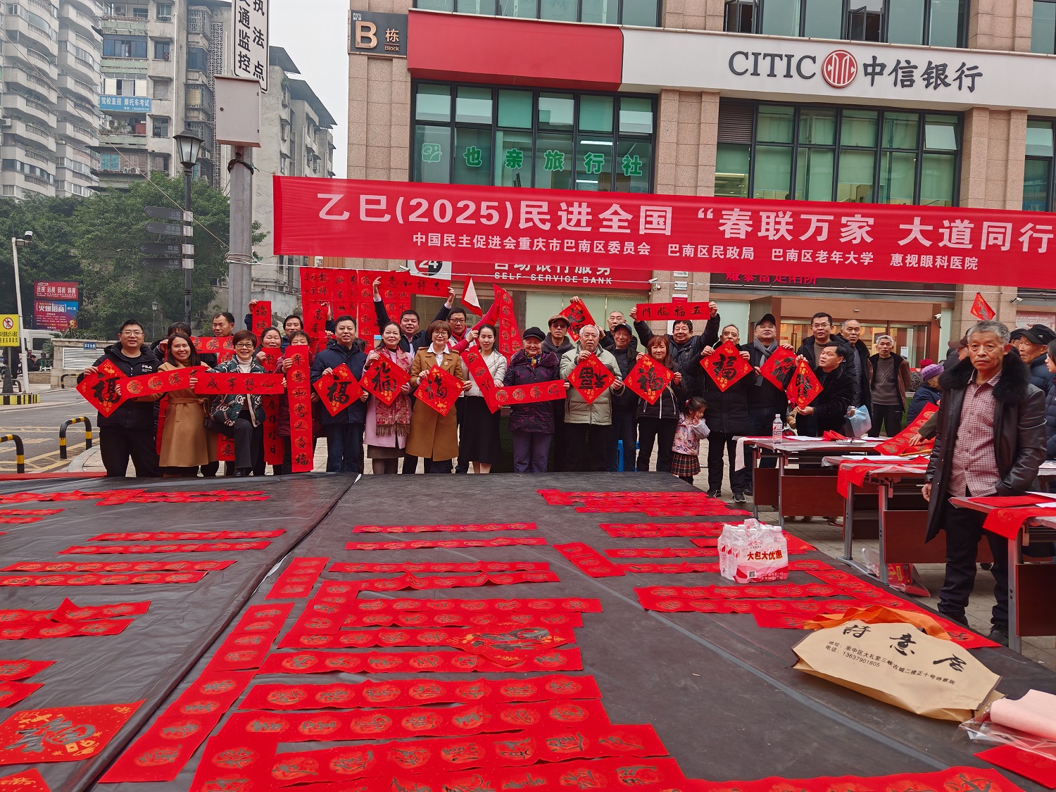 1月22日,民进巴南区委会联合区民政局、区慈善会、区老年大学、惠视眼科医院在鱼洞街道开展乙巳(2025)“春联万家·大道同行”活动。民进巴南区委会主委、区政协副主席姜莹星出席活动。