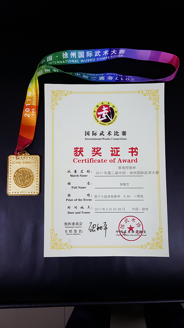 5月26-28日,由国家体育总局武术运动管理中心、中国武术协会主办的2017年第二届中国徐州国际武术大赛在徐州市奥运中心举行。 民进荣昌区委委员邹朝文等12名运动员参加了比赛。经过激烈角逐,邹朝文捧得小洪拳金牌。