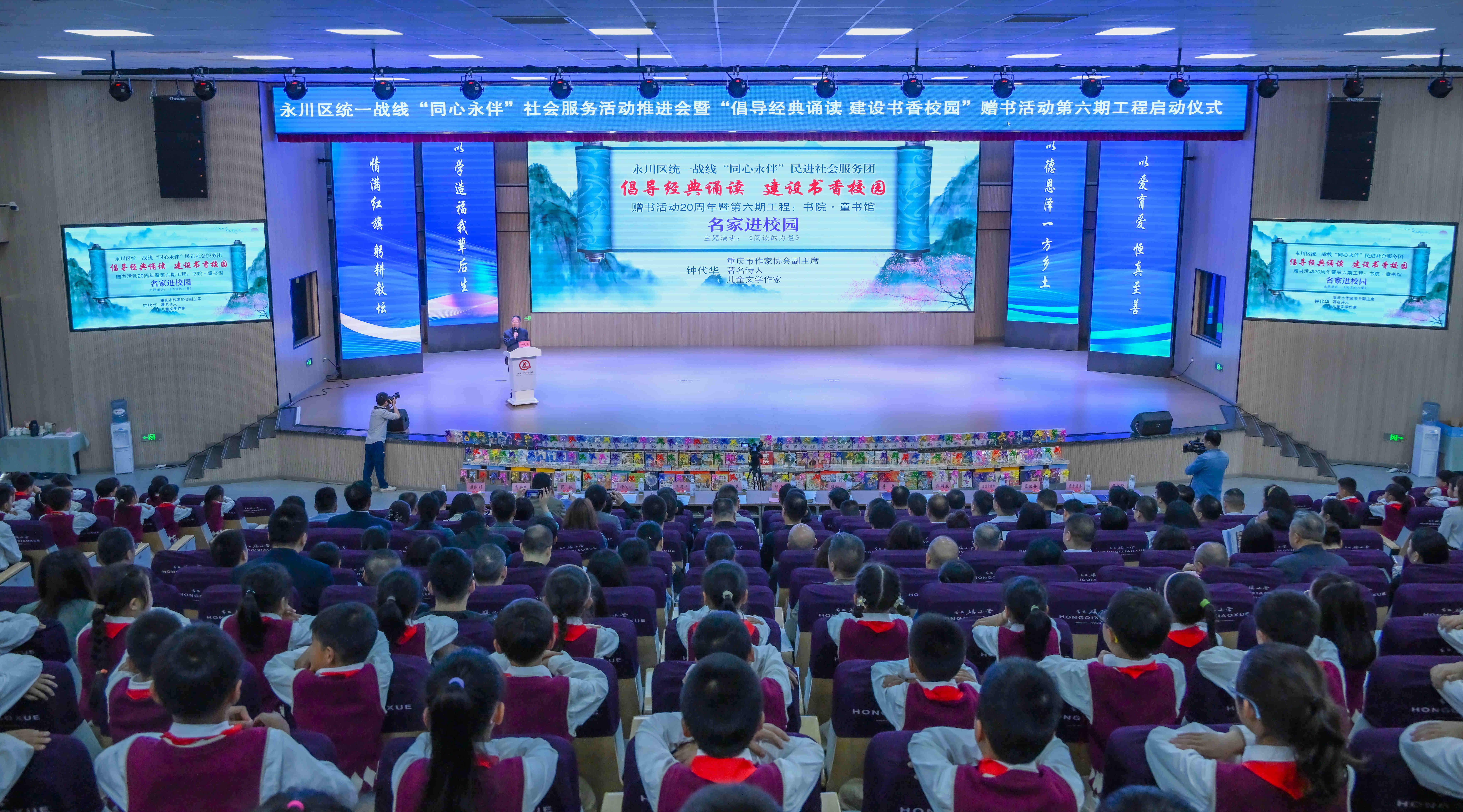 4月23日,永川统一战线“同心永伴”民进社会服务团“倡导经典诵读,建设书香校园”赠书活动20周年暨第六期工程:书院·童书馆在红旗小学文昌路校区启动。中共永川区委常委、统战部部长陈小东出席并宣布赠书活动第六期工程启动。重庆市作家协会副主席、永川区政协原副主席、民进永川区委会原主委钟代华出席活动。