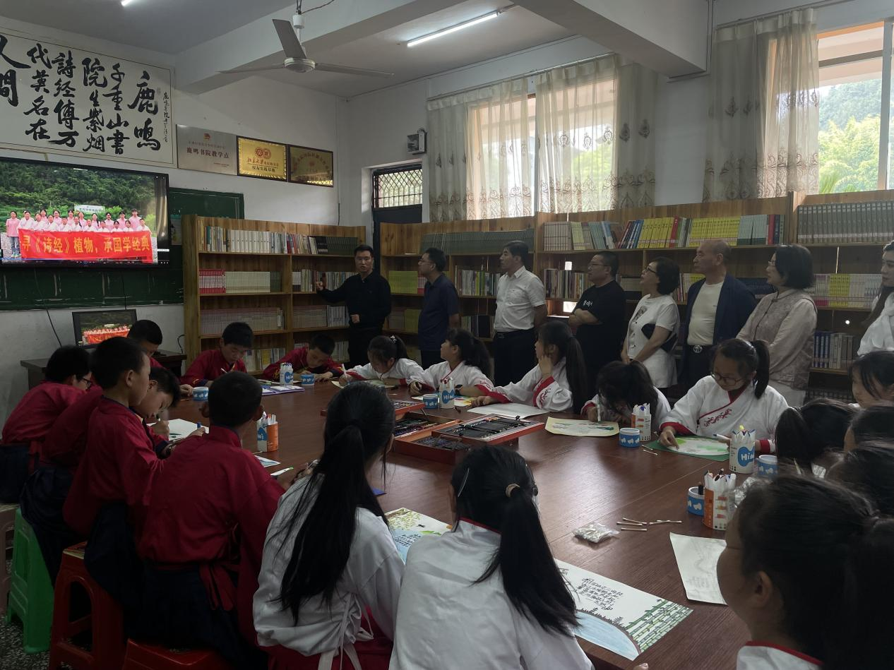 调研组一行在鹿鸣书院诗经植物园听取对诗经植物园经营情况的介绍,在鹿鸣乡中心学校了解鹿鸣书院的课程设置,观看鹿鸣书院学生诵读《诗经》。