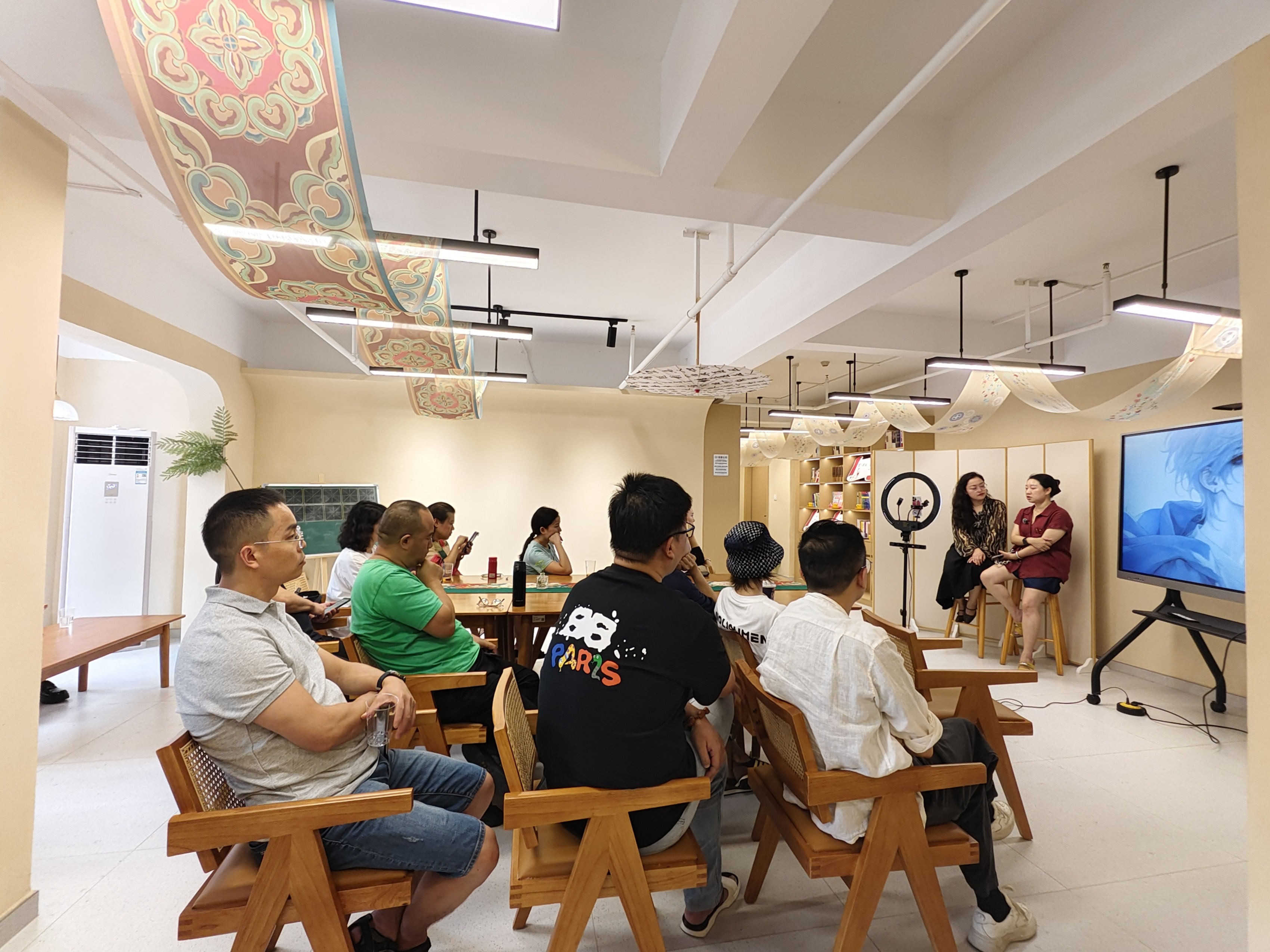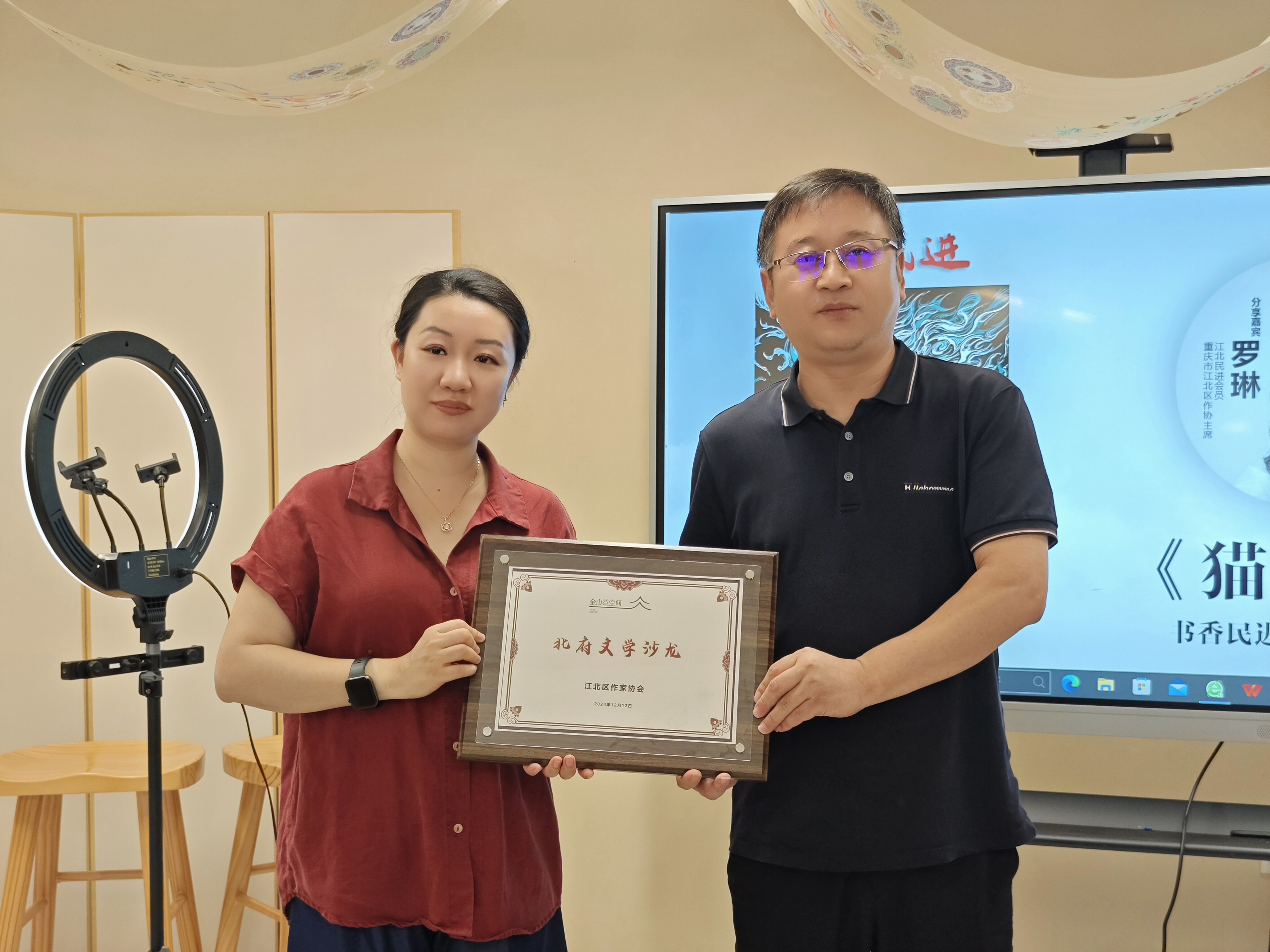 本次活动由民进江北文化支部会员王菁与其子联袂主持,“进二代”的温馨互动贯穿全场,彰显文脉传承意涵,赢得阵阵掌声。活动采用线上线下相结合的方式,罗琳通过访谈直播,与线上线下读者畅谈创作心路,剖析写作技巧,分享引发热烈共鸣。随后举行的授牌仪式上,罗琳代表区作协授予活动场地“北府文学沙龙”称号,标志着该空间正式成为区域文学交流新平台。