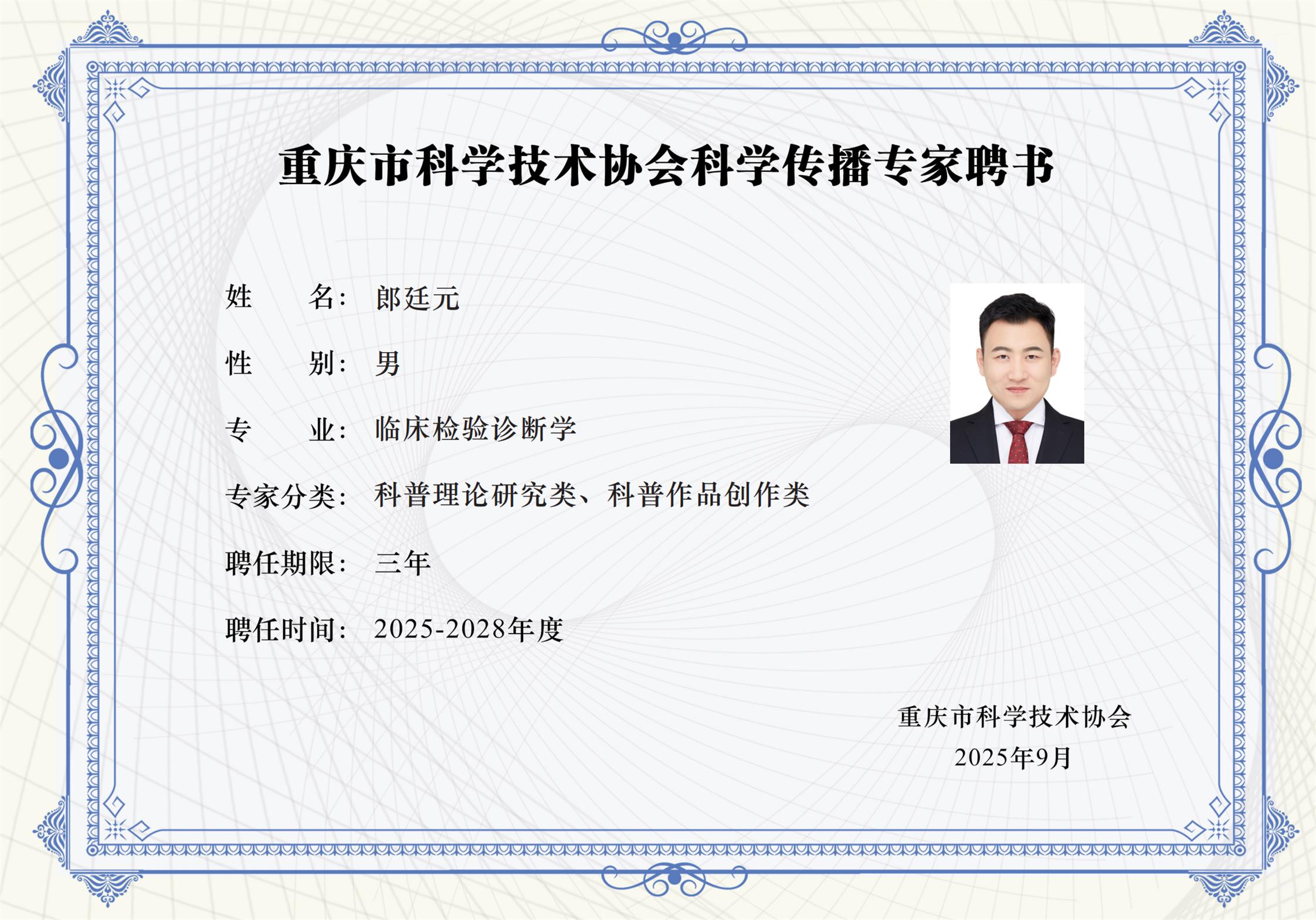 渝中民进会员、重医附一院生殖医学中心副研究员郎廷元被重庆市科协聘为科学传播专家。