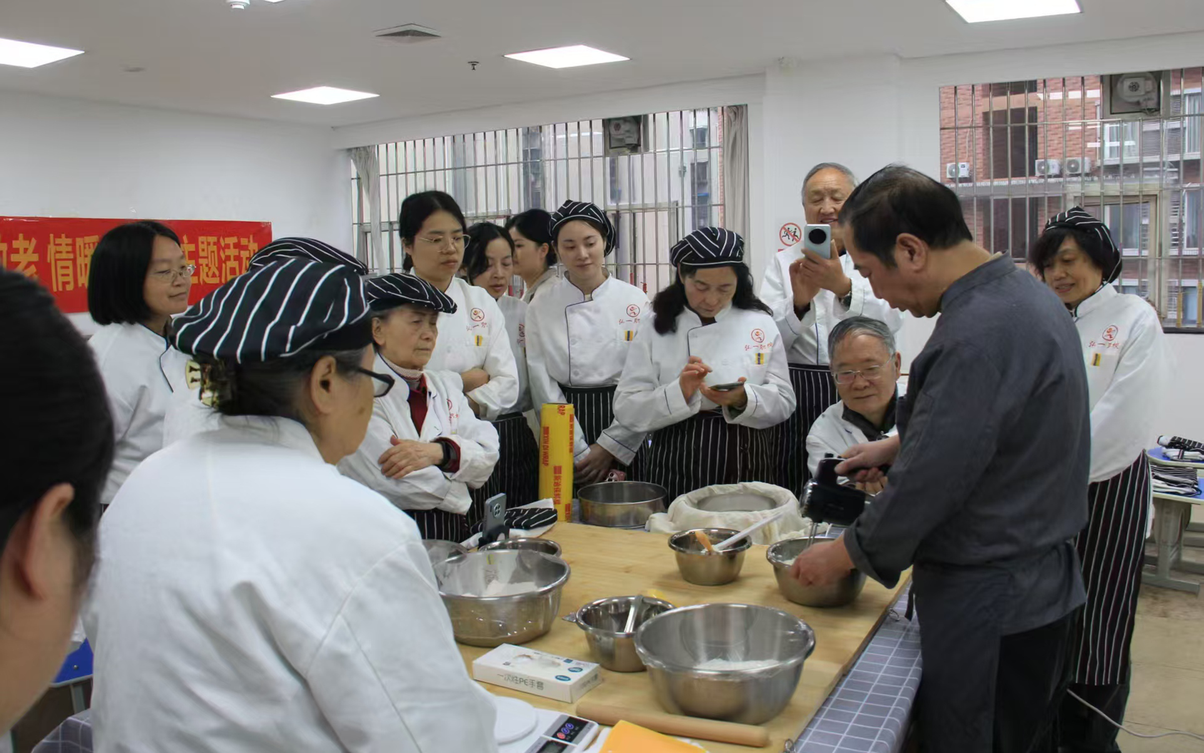 区委会特别邀请了弘一职校的专业面点师傅,现场教授桃酥和桂花糕的制作方法。师傅耐心讲解配料比例、和面技巧、造型要点及烘焙火候,老同志们则兴致勃勃,纷纷卷起衣袖,在助教的协助下动手实践。