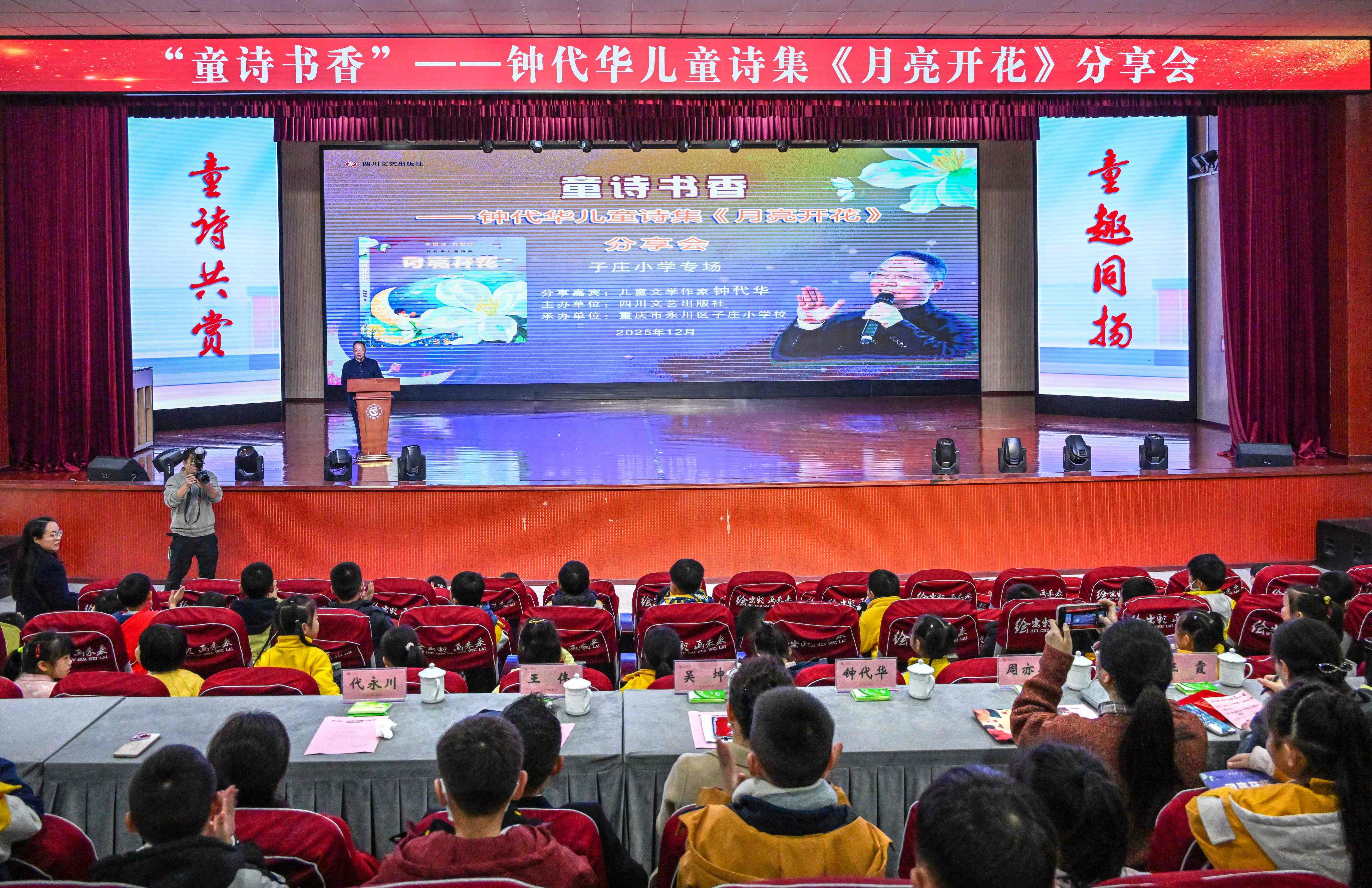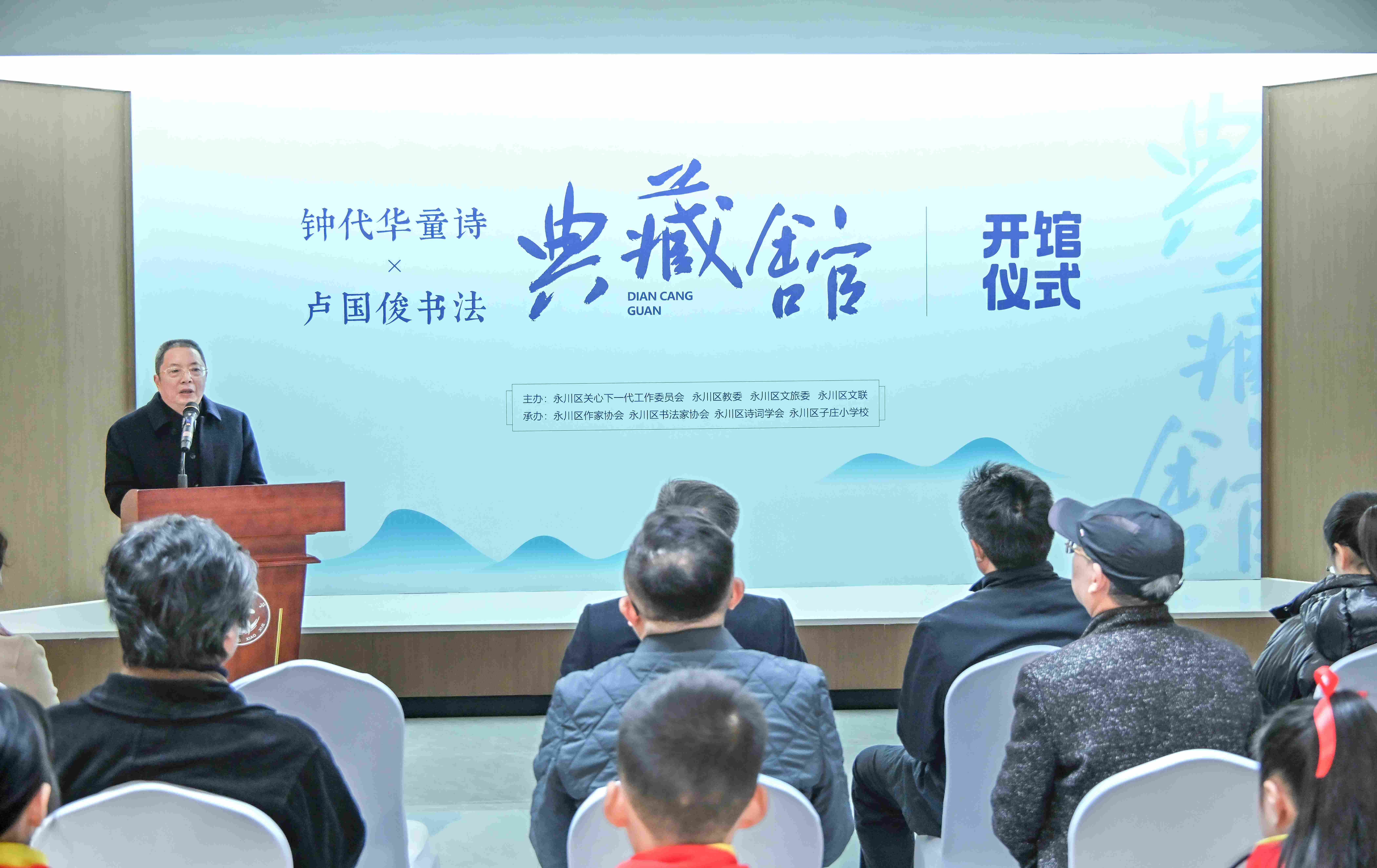 12月5日,由永川区关工委、区教委、区文旅委、区文联联合指导,区作家协会、书法家协会、诗词学会及子庄小学共同承办的“钟代华童诗·卢国俊书法典藏馆”开馆仪式暨《月亮开花》阅读分享会在永川区子庄小学成功举办。此次活动是永川推动文化教育与美育实践深度融合的一次生动体现,也是民进会员积极参与社会服务、助力文化建设的具体实践。