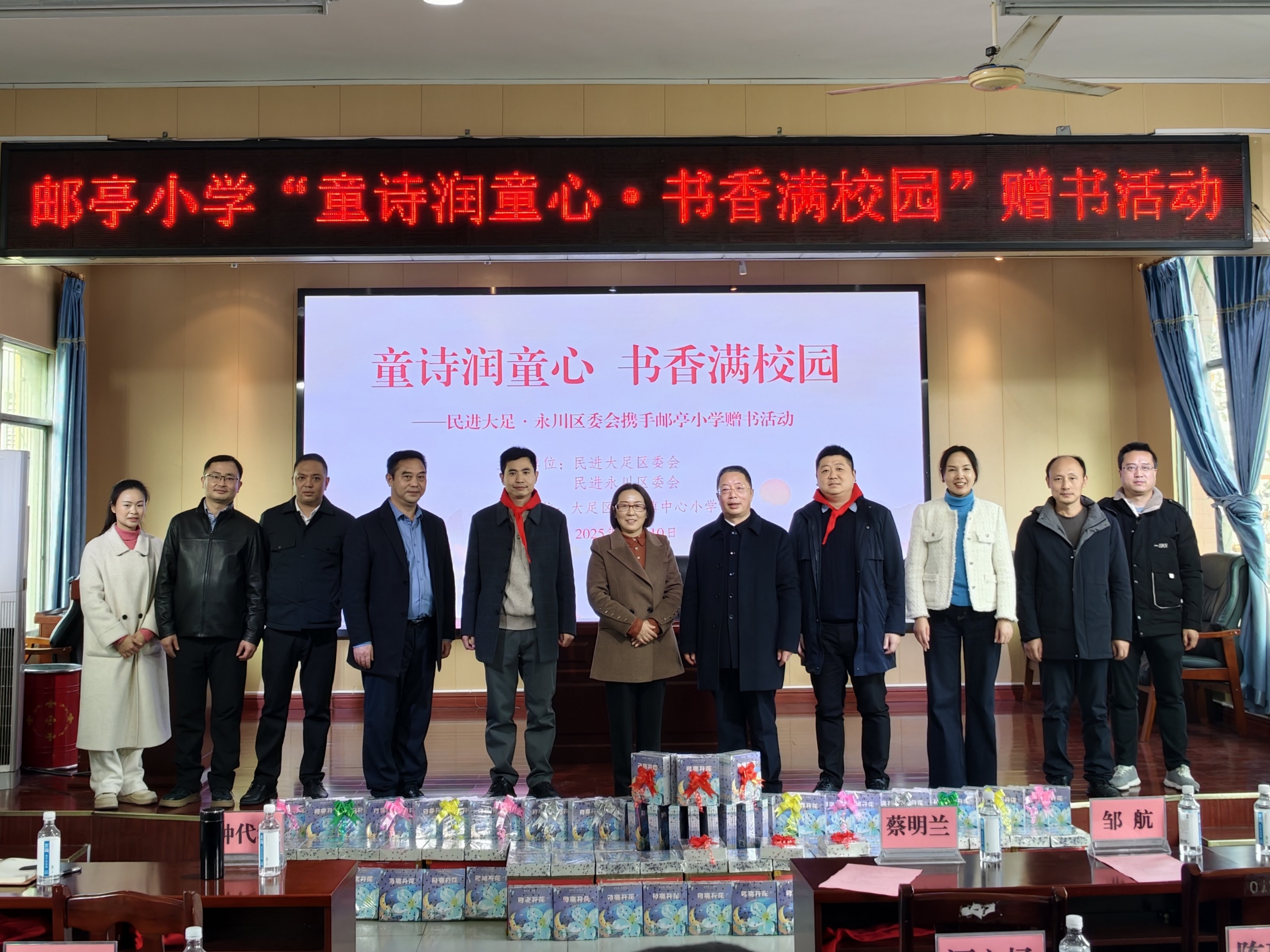 12月10日,为了营造 “爱读书、读好书、好读书”的浓厚校园氛围,民进大足区委会联合民进永川区委会走进大足区邮亭小学,开展“童诗润童心·书香满校园”赠书活动,大足区政协副主席、民进大足区委会主委蔡明兰出席并致辞,永川区政协原副主席、一级巡视员、儿童文学作家钟代华参加活动。大足区教委、邮亭镇、邮亭小学相关人员以及爱心企业代表与学生代表共同参与,一起见证了这份藏在书本里的温暖传递。