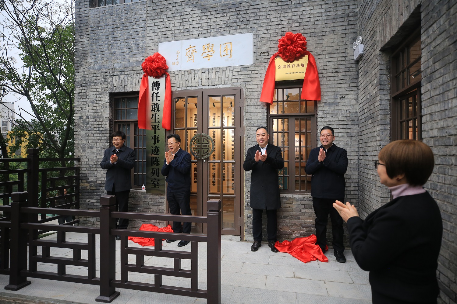 陈贵云、陶世祥,何永革、罗挺分别为“傅任敢生平事迹陈列室”和“民进重庆市委会会史教育基地”揭牌。仪式上还播放了傅任敢亲属的祝贺音频,宣读了来自首都师范大学教育学院的贺信。