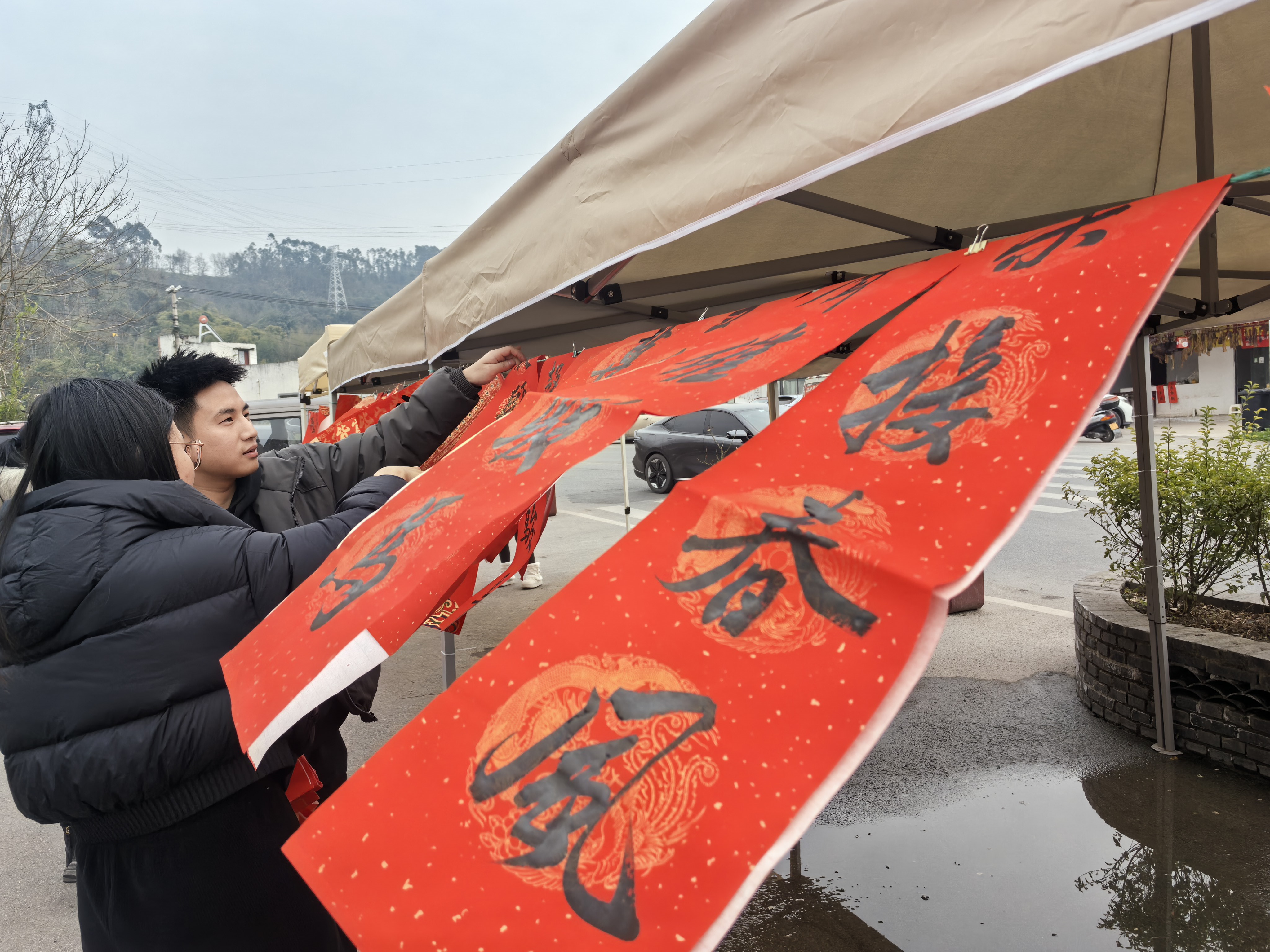 活动现场来自民进璧山区总支的书法家会员及文化界会员热情挥毫,将新春的祝福倾注于一副副红火的对联与“福”字之中。笔走龙蛇间,“一帆风顺年年好,万事如意步步高”“策马扬鞭新征程,同心聚力兴乡村”等既富含传统年味、又呼应时代气息的联句跃然纸上,吸引了众多赶集群众驻足欣赏、争相领取。大家手捧墨迹未干的春联,脸上洋溢着喜悦的笑容,现场气氛热烈而祥和。