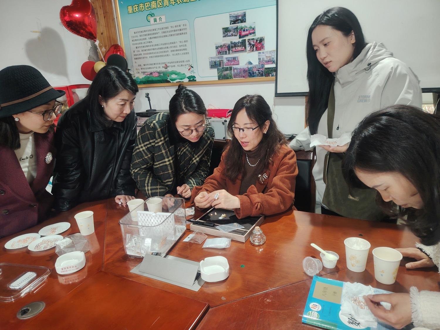 接下来,在区巾帼新农人的农庄里,珠宝鉴定师、民进会员王双为大家介绍珍珠基础知识和养殖历史,从建国初期周恩来总理指示建立我国第一个淡水珍珠养殖基地,外贸换购钢材以支援建设的经济策略,到如今浙江诸暨山下湖成为全球最大珍珠批发市场的领先地位,会员们在认识不同品类、颜色、海域珍珠的同时,由衷赞叹祖国的伟大强盛、珠农的勤劳奋进,感慨所有挫折和磨难如同砂砾,在珍珠质层层包裹下,在母贝温柔而强大的力量里,经岁月积淀,最终都成为晶莹圆润的珍宝。随后,会员们现场开启“珍珠盲盒”,清洗、钻孔、粘胶,带着亲手制作的珍珠饰品和独特体验尽兴而归。