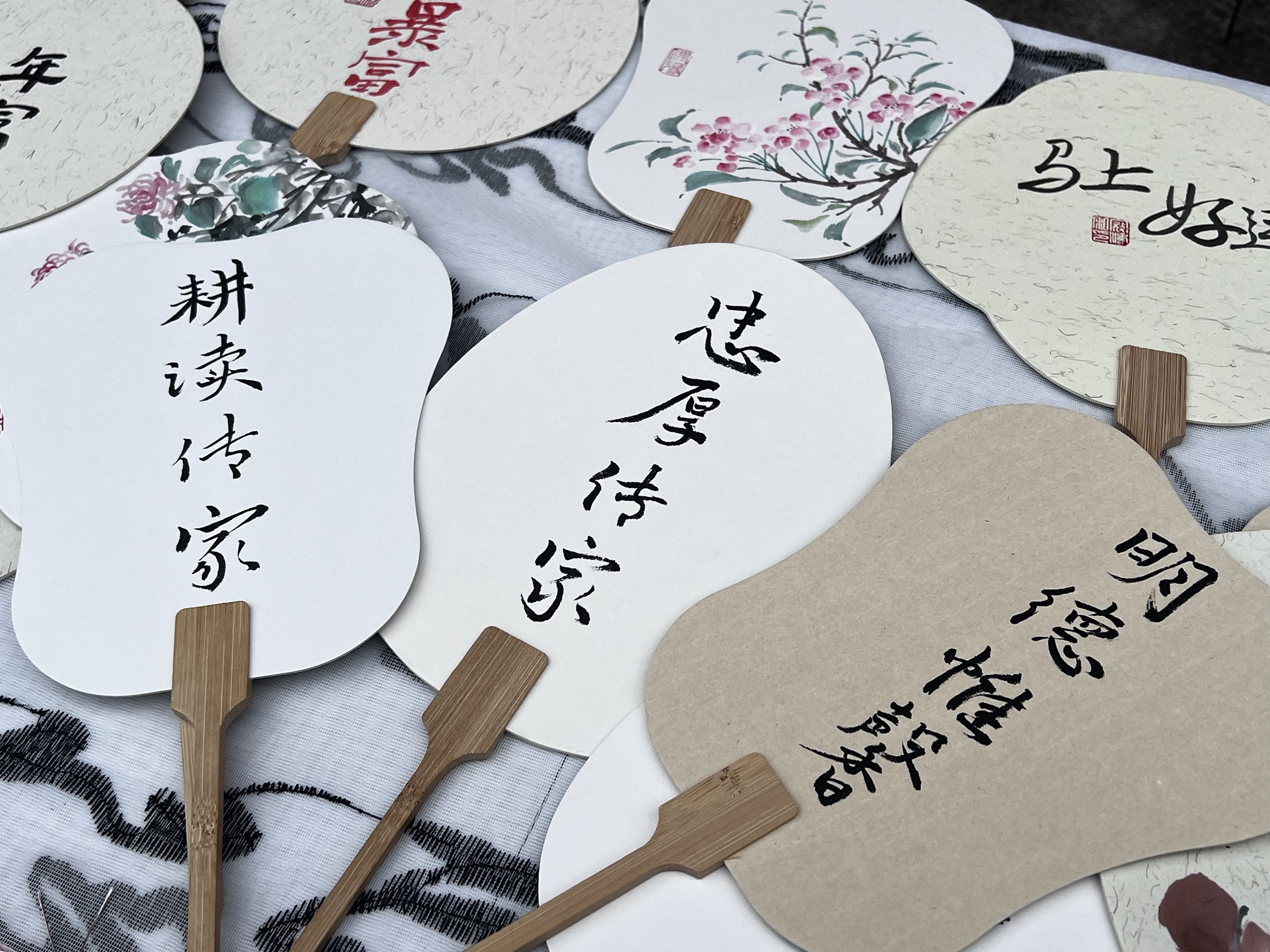 除了旧物交换和二手集市,原江北开明书画院秘书长寇涛精心绘制了多把以家风家训为主题的扇面进行公益售卖,将传统文化以生活艺术的形式,走进寻常百姓家。民进会员刘盈盈为到场的孩子们提供亲子共读、艺术体验,让孩子们体验了一个不一样的周末下午。