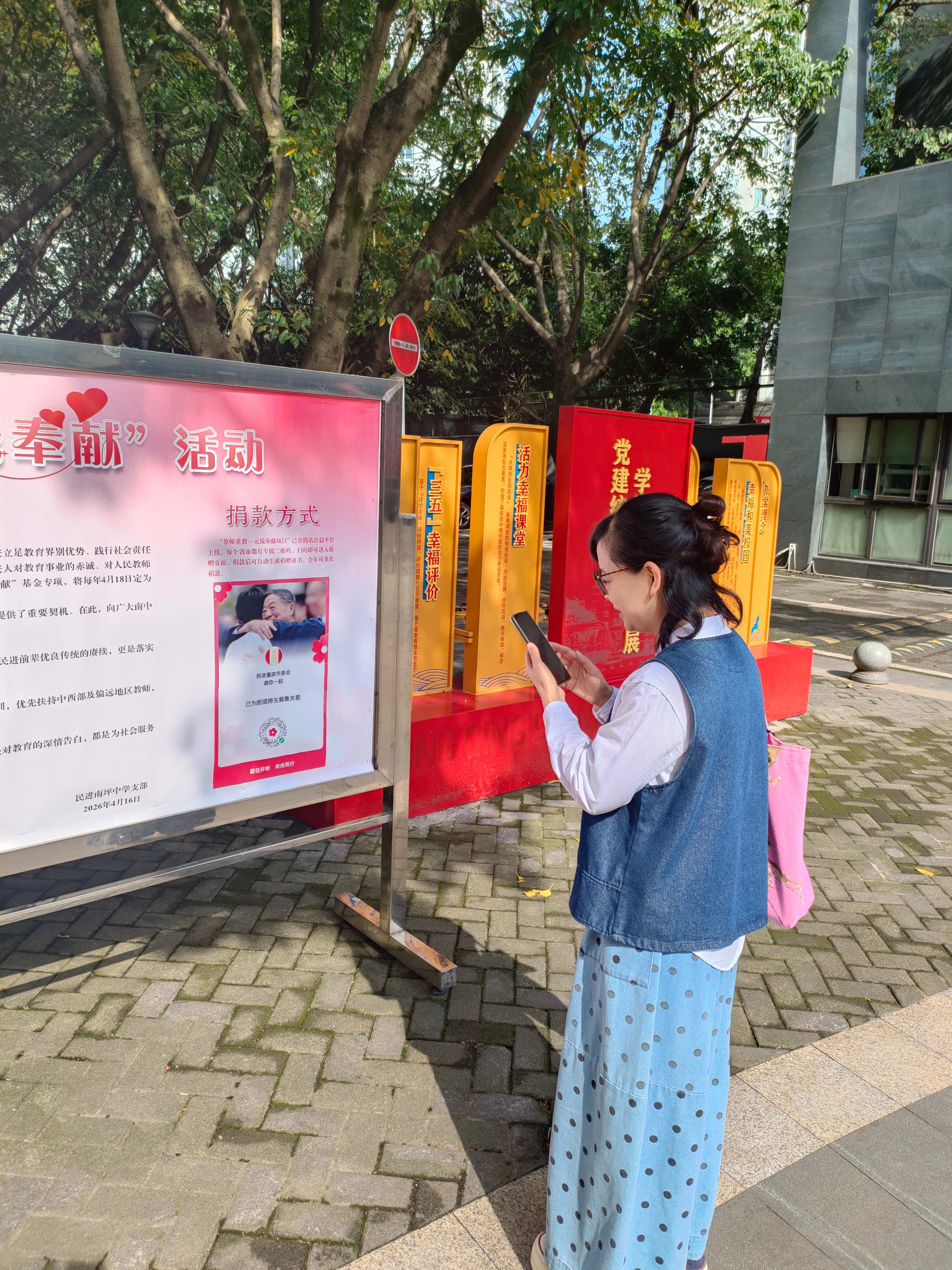 本次活动得到学校党委大力支持。学校统战工作分管领导、党委委员唐毅率先垂范,扫码捐款,唐毅委员表示,一元虽微,初心弥坚。“尊师重教一元钱奉献”不仅是对教育事业的深情助力,更是凝聚育人合力的生动实践。学校党委将持续支持民进支部履职尽责,携手深耕教育沃土,共促学校高质量发展,共迎七十华诞荣光。