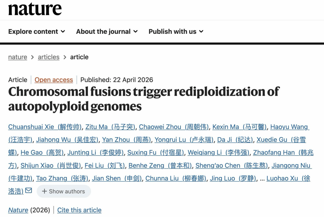 近日,西南大学学校科研团队在鱼类演化生物学研究领域取得重大突破,相关成果以《染色体融合驱动同源多倍体基因组再二倍化》(Chromosomal fusions trigger rediploidization of autopolyploid genomes)为题发表在《自然》(Nature)期刊上。西南大学为论文第一完成单位和通讯单位,民进会员、西南大学生命科学学院教授徐洛浩,西南大学水产学院教授刘海平和德国科学院院士Axel Meyer教授为共同通讯作者,西南大学种质创制大科学中心博士后解传帅,生命科学学院博士研究生马子突,水产学院博士研究生马可馨与周朝伟教授为共同第一作者。西南大学淡水鱼资源与生殖发育教育部重点实验室提供了重要科研平台支撑。该研究系统揭示了脊椎动物全基因组复制(WGD)后“再二倍化”(rediploidization)的触发机制及其早期演化规律。据悉,该成果是近年来我国淡水鱼演化研究领域在《自然》杂志发表的首篇论文,是我国在演化基因组学与鱼类学研究领域取得的重大突破,论文全部共同第一作者和共同通讯作者均来自西南大学。
