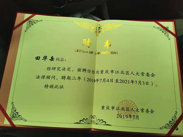 近日,江北区人大常委会法律顾问聘任仪式在江北区人大办公楼举行。民进江北区经济支部主委、江北区人大代表田华岳被聘为法律顾问。