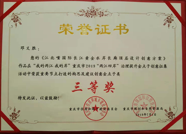 7月4日,市住房城乡建委发布重庆“两江四岸”治理提升金点子征集结果。渝中区民进会员邓义胜撰写的《江北嘴国际长江黄金水岸长廊顶层设计方案》荣获重要节点打造的构思及建议创意金点子三等奖。