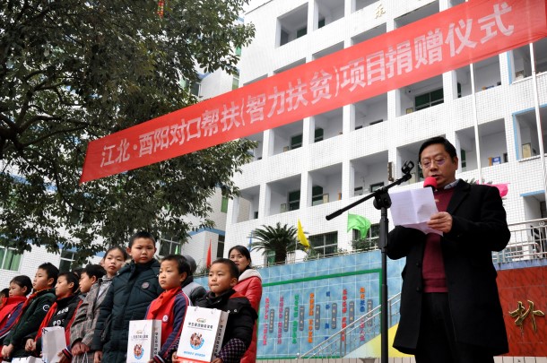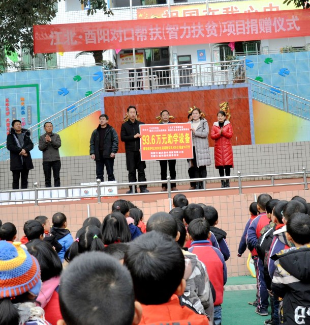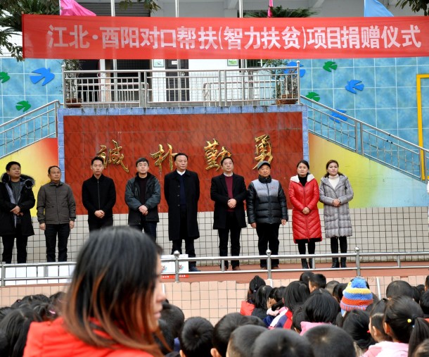 12月31日,由江北区民进会员、区工程师协会会长牵头组织,区科协、区工程师协会、区关工委、民进江北区企业家联谊会、达县商会、重庆豪申科技有限公司的负责同志,在江北区老领导李正中、彭德宣的率领下,冒着低温天气前往酉阳县丁市镇中心校,举行了江北·酉阳对口帮扶(智力扶贫)项目捐赠仪式。