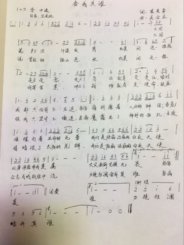 “当疫情黯淡了太阳的光辉,我们是防病治病的白衣天使,众志成城,砥柱中流,力挽狂澜,舍我其谁......”。1月29日,由袁贵勇作词,大足区民进会员吴全生谱曲的《舍我其谁》正式发布,以铿锵高昂的旋律,坚定自信的歌词展示了疫情当前白衣天使所肩负的责任、面对的困难和无所畏惧的精神。