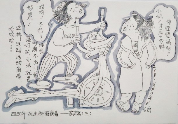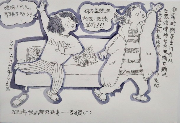 医务篇受到了全校师生和家人的高度认可,在大家的鼓励下,张渝萍创作热情一发不可收拾。她筛选了一些和疫情防控相关的重要知识点,结合自己宅在家和女儿发生的趣事,以及在社区的所见所闻进行创作。如社区篇一、二幅倡导大家少串门、注意消毒,家庭篇二、三幅提醒宅在家里多运动,图五告诉大家别出门,宅在家里就是做贡献等。