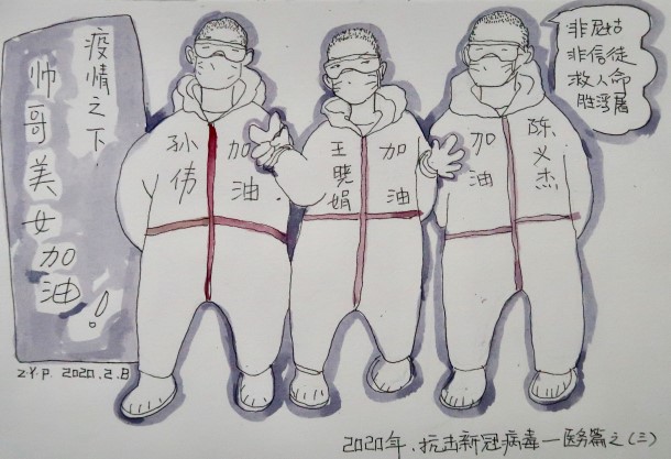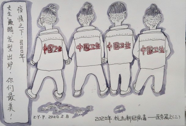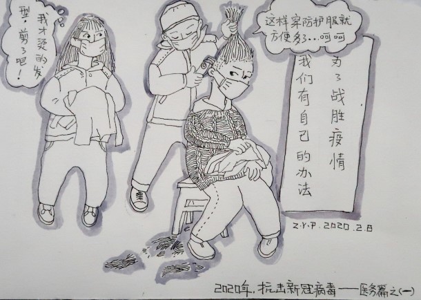 漫画分为了医务篇、家庭篇、社区篇三个部分。张渝萍说,首先创作的是医务篇。“前几天看到新闻,许多女性医务工作者为了穿防护服方便,剪短了刚做的头发。我非常感动,所以先创作了三幅作品。”