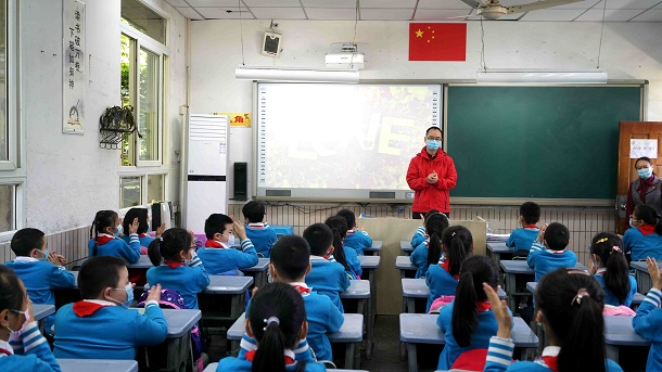 这特别的开学第一课备受大家关注。学生们从校园入口处测体温,错峰、分批进入校园,随着新学期第一道铃声的响起,陵园小学开学第一课正式拉开序幕。有的班级坐在教室里,在班主任的带领下共同学习疫情防控知识,还有的班级正在进行入厕路队和上下楼课间活动路队的训练。各个班的同学们都在有序地进行第一课的学习。