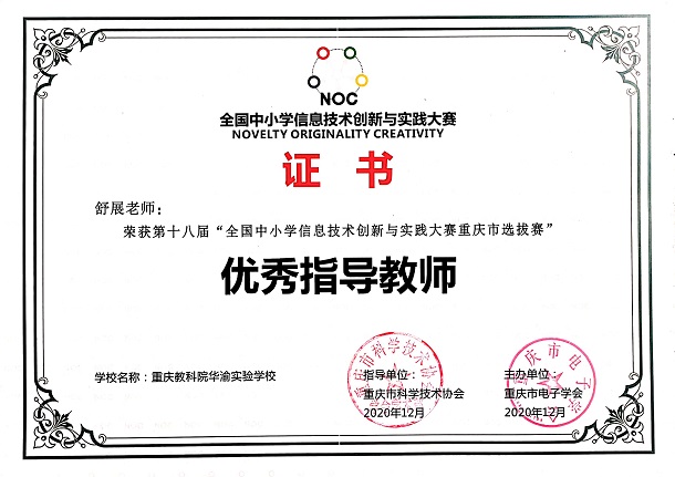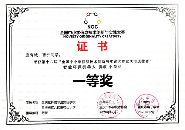 近日,第十八届全国中小学信息技术创新与实践大赛(简称NOC大赛)重庆市选拔赛决出成绩,由江北区民进会员、重庆市教科院华渝实验学校科学教研组长舒展指导的两名学生获得智能环保机器人项目小学组一等奖,舒展同时获得优秀指导教师奖项。