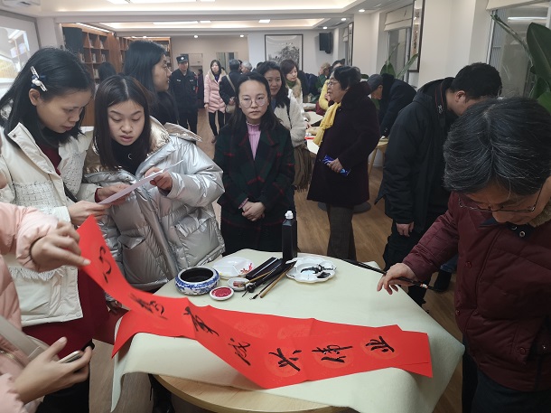仪式现场为社区居民书写、赠送春联