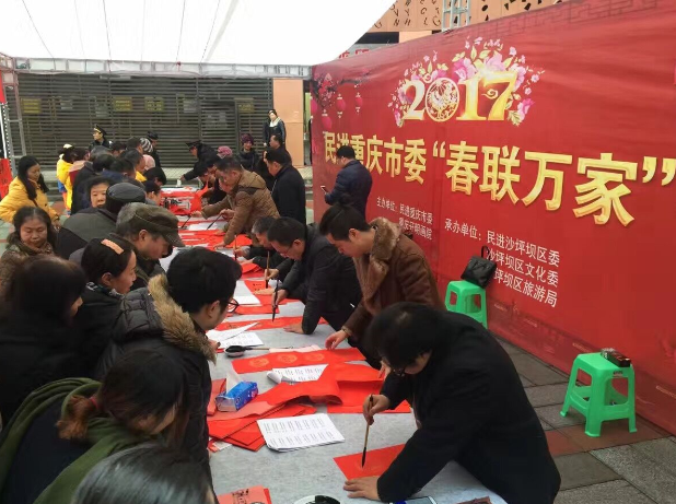 2017年1月11日下午,由民进重庆市委、民进重庆开明画院主办,民进沙坪坝区委、沙坪坝文化委、沙坪坝旅游局联合承办的“春联万家”活动在沙区三峡广场开展。