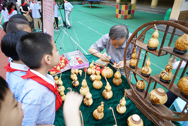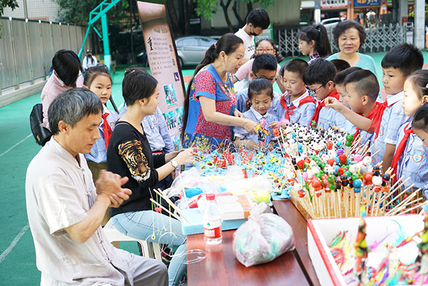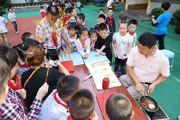 在渝中区中华路小学,2017年“非遗进校园”活动就以“振兴中华传统工艺”为主题,给孩子们留下了深刻的记忆。活动现场,女孩们在光彩照人的蜀绣扇面和憨态可掬的布艺玩偶前流连忘返,男孩们则对精巧玲珑的古船模型和用米粒般大小碎蛋壳镶嵌成花纹的漆器爱不释手,而蝇头小楷书法展示、手把手竹雕体验和好看更好吃的糖画摊位前更是排起了长龙……参加活动的十余位“非遗”传承人一边进行项目演示,一边为孩子们仔细讲解这些神奇技艺的每一道工序和来由,讲述每一件作品背后意趣盎然的历史故事和传说。看着孩子们阳光般灿烂的笑容,谭小兵感慨道:“发扬和传承传统文化,更多时候还应该让传统技艺回归日常生活,让孩子们能用眼看到、用手摸到,在心中播下尊重和喜爱的种子,才能永葆传统文化的生命力!”