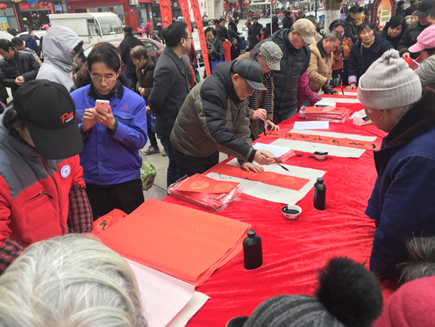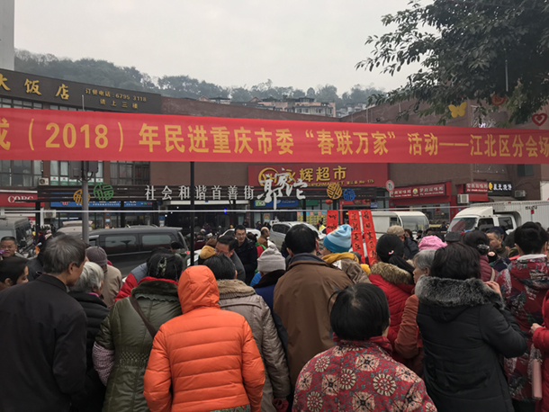 2月1日,民进江北区委会组织书画界会员走进郭家沱街道和铁山坪街道开展“春联万家”活动,为社区居民现场写春联送年画,用实际行动给社区居民送去新春的祝福。区委会主委谢平、副主委桂飞出席活动。