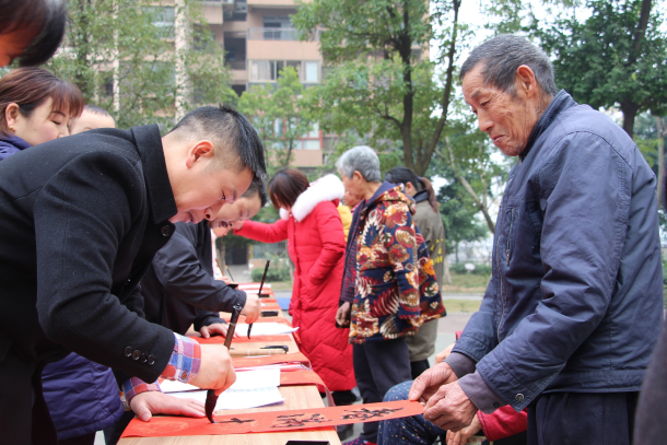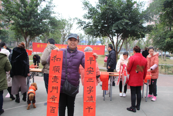 活动现场热闹非凡,不少居民们纷纷慕名而来,挑选自己喜欢的联语,请书法家们书写对联。来自民进大渡口区委会的书法家们与居民进行沟通交流,一幅幅充满喜庆、吉祥、祝福的春联和“福”字在他们笔下泼墨挥洒。居民们纷纷称赞自己手中的书法作品,“我家就喜欢这种手写春联,今天挑了对喜欢的春联请书法家来写,手书的春联当然比印刷的更有意义。”