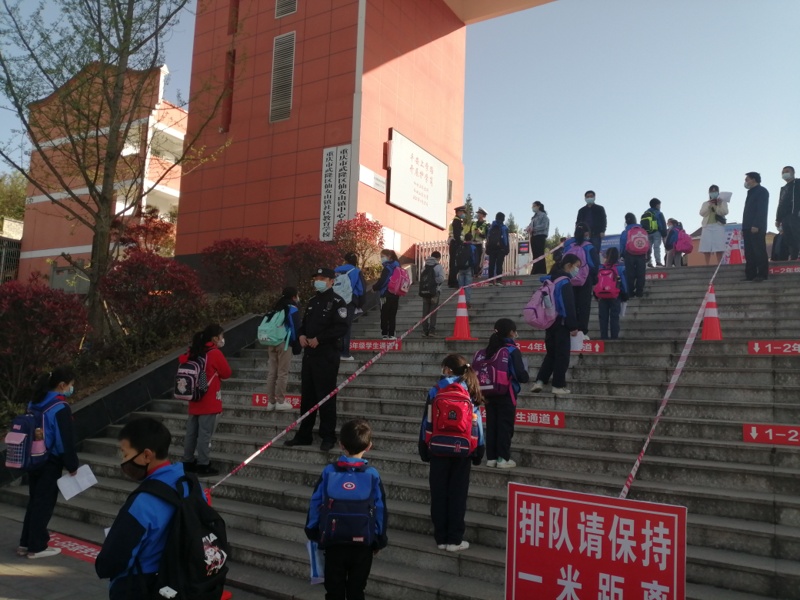 为确保学生平安返校复课、打好疫情防控战,学校进行了精心准备,严控交叉感染。远远就看见校门口安保人员和老师佩戴口罩,引导学生有序上下阶梯,由于小学年级和班级较多,学校在大门口阶梯实行分年级单边通道,防止校门过度聚集;学生在校内排队依次进入教室、食堂、厕所等,保持一米的安全距离,井然有序;每名同学均佩戴口罩,在集体学习生活中自觉自主、尊重他人。