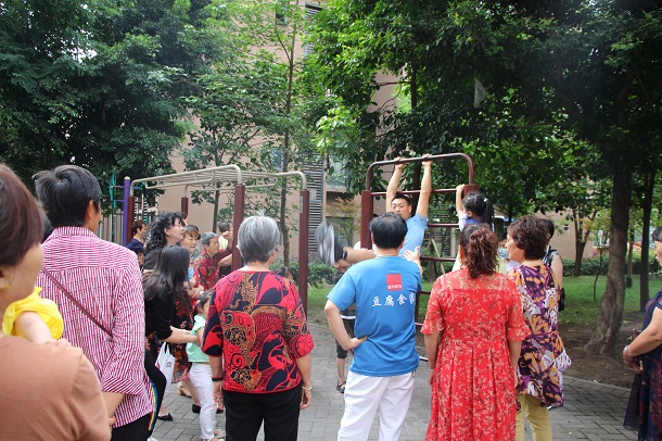 活动特邀全国社区体育一级指导员、重庆95中学校体育教研组长吴志强老师对社区居民进行授课和培训。他从提升身体素质、舒缓工作和生活压力、构建幸福和谐家庭等多方面讲解了锻炼的好处以及中老年朋友锻炼应该注意的事项。随后,吴老师带领大家来到回龙桥社区的健身区域,讲解了每一项器材的功能和正确使用方法,并示范动作要领。根据居民朋友们现场模仿学习的情况,吴老师通过认真观察和分析,逐一指出居民在使用健身器材时的注意事项,并手把手纠正错误动作。