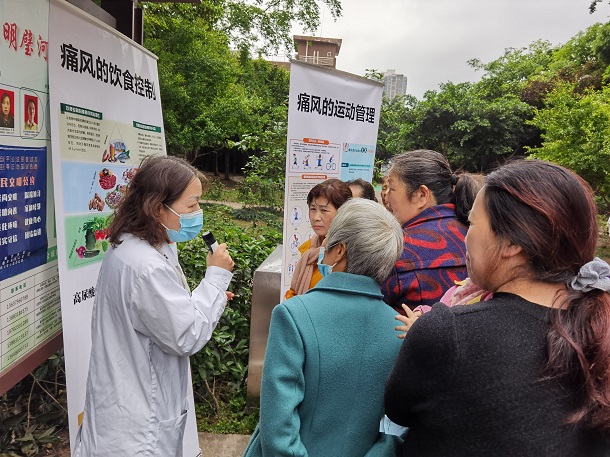 彭彩碧为前来检测的居民作了健康知识讲座,介绍了高尿酸血症存在的诸多危害,提醒大家需要提前预防,不能等到痛风发作时才给予关注和治疗。她在讲座中强调控制饮食中的嘌呤摄入对降低尿酸的重要性,向居民宣传如何通过改善饮食习惯来提高身体素质,提倡采取低盐少油的饮食方式,要清淡饮食多吃新鲜蔬菜水果,平时多加强锻炼等,提高疾病预防的意识。