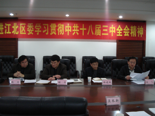 12月11日,民进江北区委召开四届十七次区委(扩大)会,专题学习贯彻中共十八届三中全会精神。民进江北区委主委、区政协副主席谢平出席会议并讲话,区委会主(副)委、区委委员、会员中的“两会”人员以及支部主任30余人参加了会议。