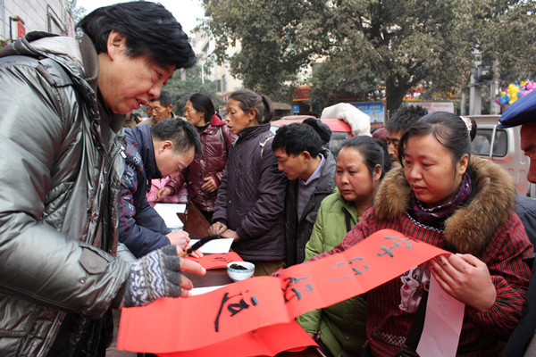 1月24日,民进荣昌县委组织易华伦、梅华成、林之彬、王溟濂等书法家会员到河包镇开展为群众义务书写春联活动。活动中共计送出春联400余幅,为群众送上了美好的新春祝福,受到当地百姓热烈欢迎。