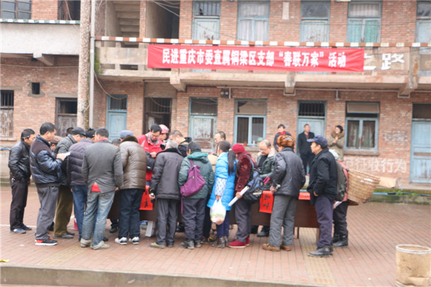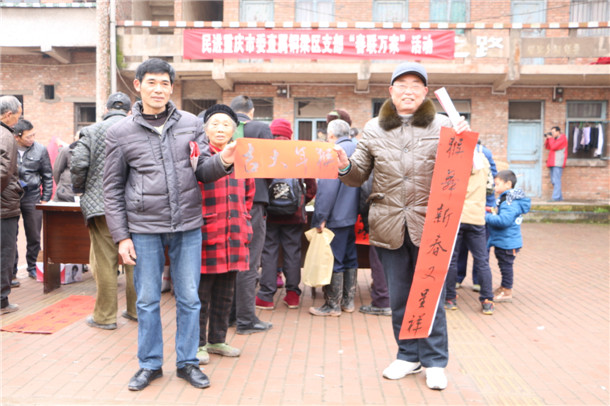 除夕将近,春寒料峭,2016年2月4日上午,铜梁最南部最边远的安溪镇街头人头攒动,好不热闹。在镇政府门外街头的一块空地上,民进重庆市委直属铜梁支部的会员们一边送年画,两位书法家一边现场写春联,免费赠送给群众,以送去新春的美好祝福。见书法家们龙飞凤舞挥就的春联一幅比一幅漂亮,数百群众都争着要。