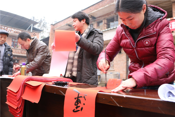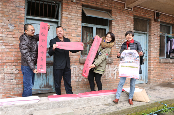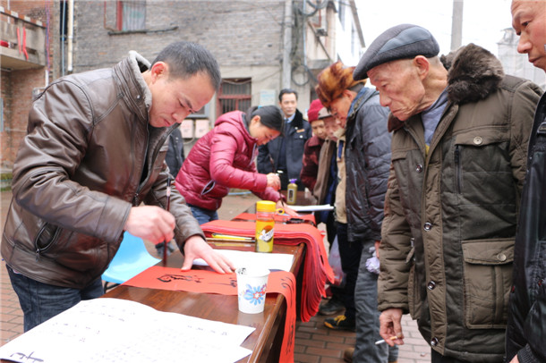 在安溪镇政府干部们的帮助下,刘放、吴小丽有了大展身手的场地:三张长桌。两人快速倒出墨汁,将事先裁剪好的红纸搬到桌上。这时,不少群众就围了过来。“这个字写得好,比印刷体高级多了!”“我们只看到过帅哥写毛笔字,没想到今天还见识了一位女书法家!”“你们这个要钱吗?”不少群众开始忍不住称赞并询问。当得知是免费送他们的时候,群众们都争着要,有的一人就要了三四幅,说要把家里的门框都贴上;有的排队等了一阵子,拿到春联后兴奋不已,给过路的熟人大声朗读上面的字;还有有点文人气息的群众写了一些自认为不错的春联,他们说,就差一手好字,今天很有幸终于如愿了。